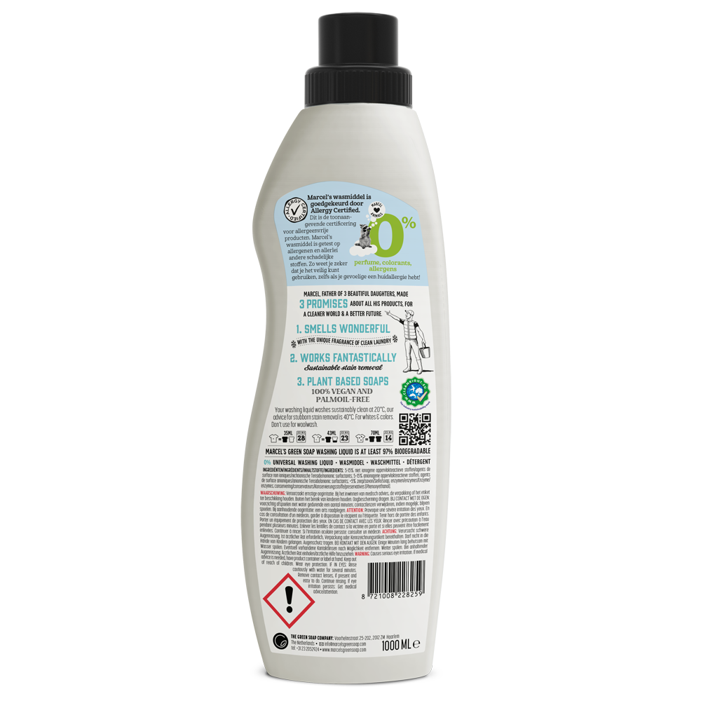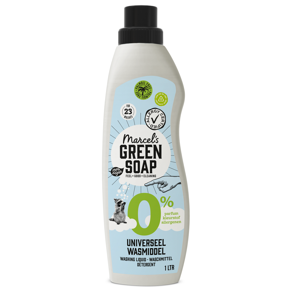 Marcel's Green Soap Universeel Wasmiddel 0% voor de witte en de gekleurde was. Dit wasmiddel bevat geen parfum en kleurstoffen. Speciaal ontwikkeld voor de gevoelige huid. Fles leeg? Vul ‘m eenvoudig bij met de Universeel Wasmiddel Navulverpakking 0% en bespaar plastic!