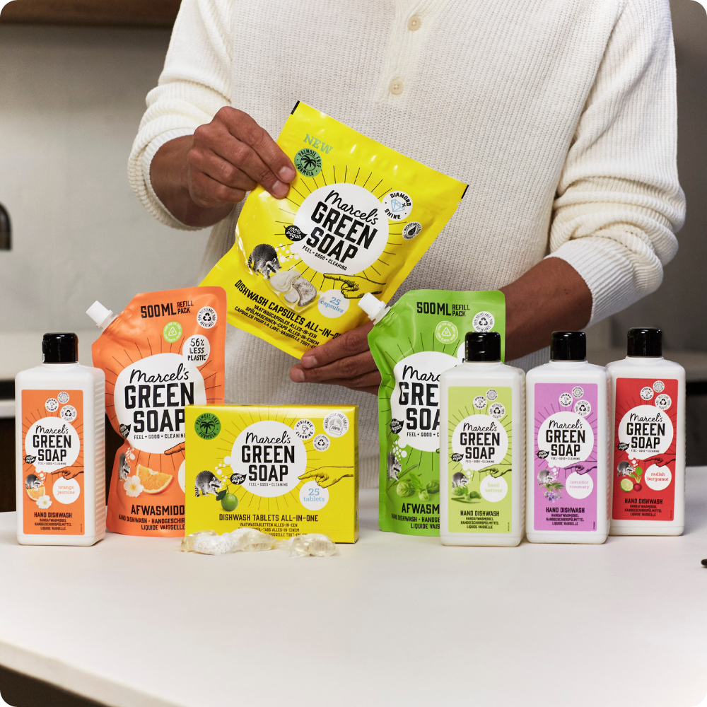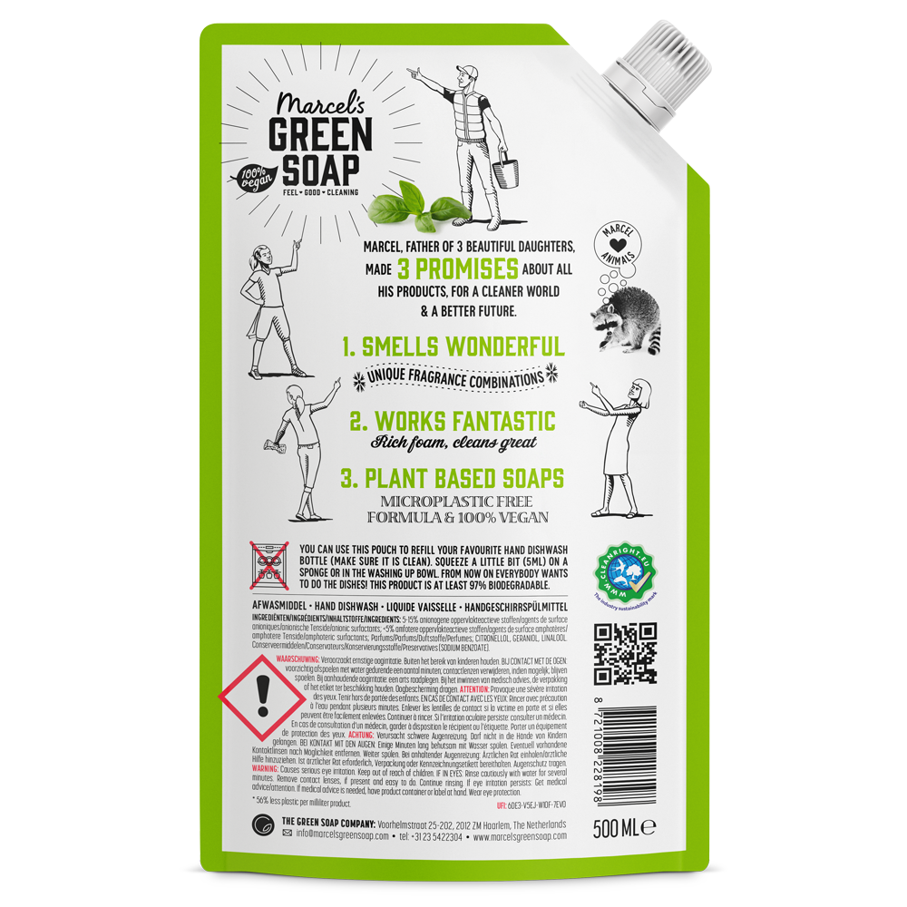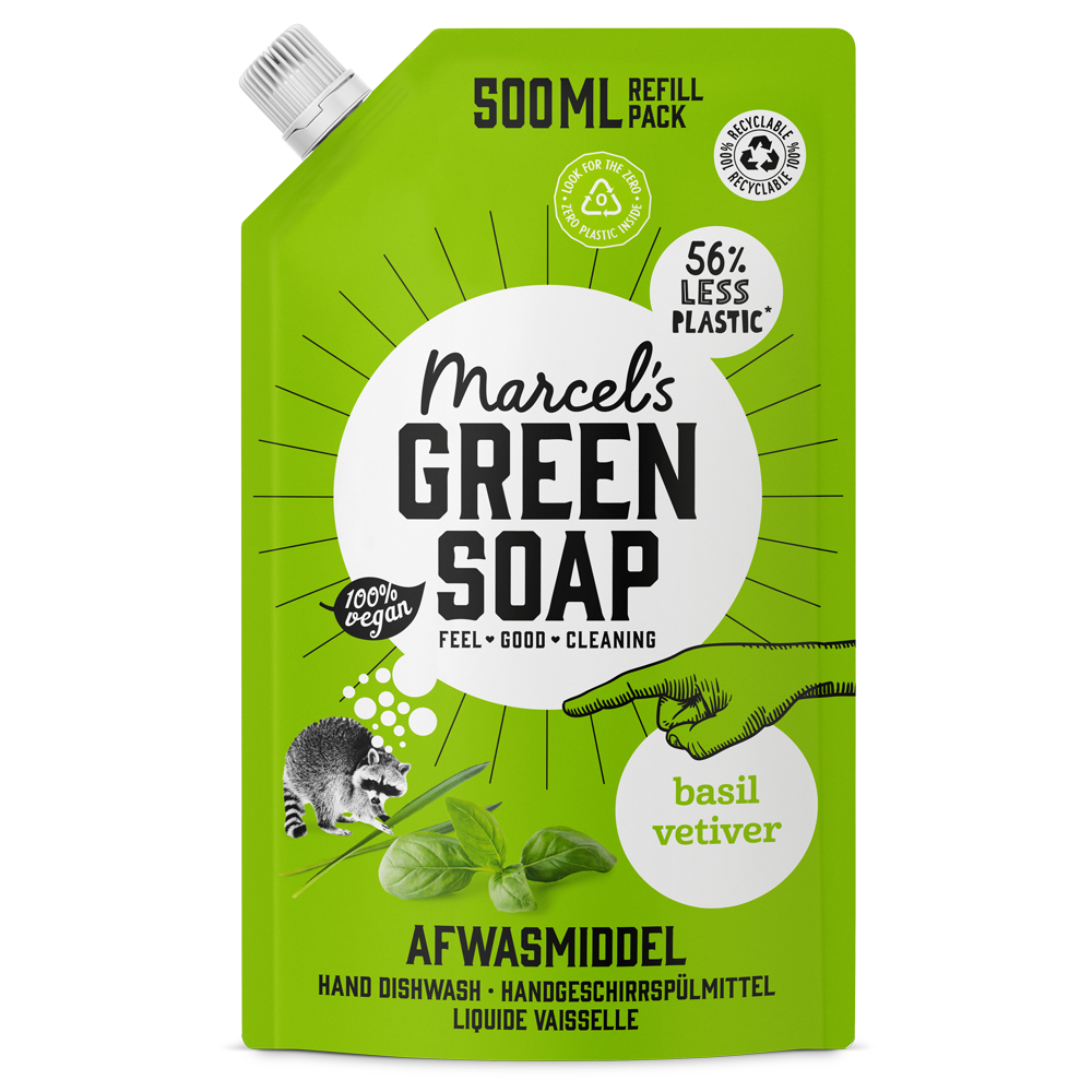 Marcel's Green Soap Afwasmiddel voor een stralend schone vaat. Met de heerlijke geur van Basilicum & Vetiver voor een verfrissend en ontspannen handafwasje. Met deze voordelige navulverpakking bespaar je 56% plastic t.o.v. de fles.