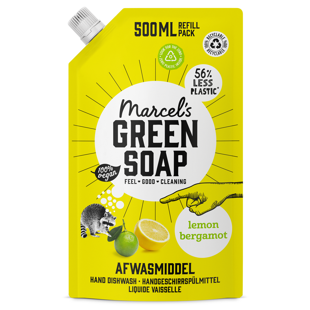 Marcel's Green Soap Afwasmiddel voor een stralend schone vaat. Met de heerlijke geur van Citroen & Bergamot voor een verfrissend en ontspannen handafwasje. Met deze voordelige navulverpakking bespaar je 56% plastic t.o.v. de fles.