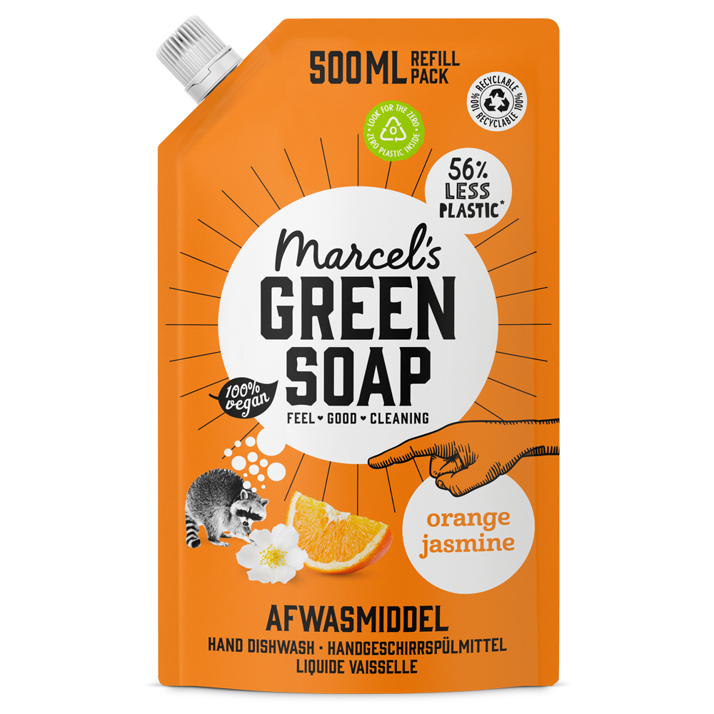 Marcel’s Green Soap Afwasmiddel voor een stralend schone vaat. Met de heerlijke geur van Sinaasappel & Jasmijn voor een verfrissend en ontspannen handafwasje. Met deze voordelige navulverpakking bespaar je 56% plastic t.o.v. de fles.