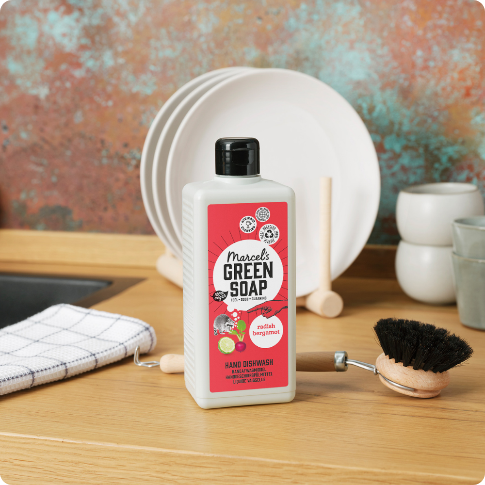 Marcel’s Green Soap Afwasmiddel voor een stralend schone vaat. Met de heerlijke geur van Radijs & Bergamot voor een verfrissend en ontspannen handafwasje.
