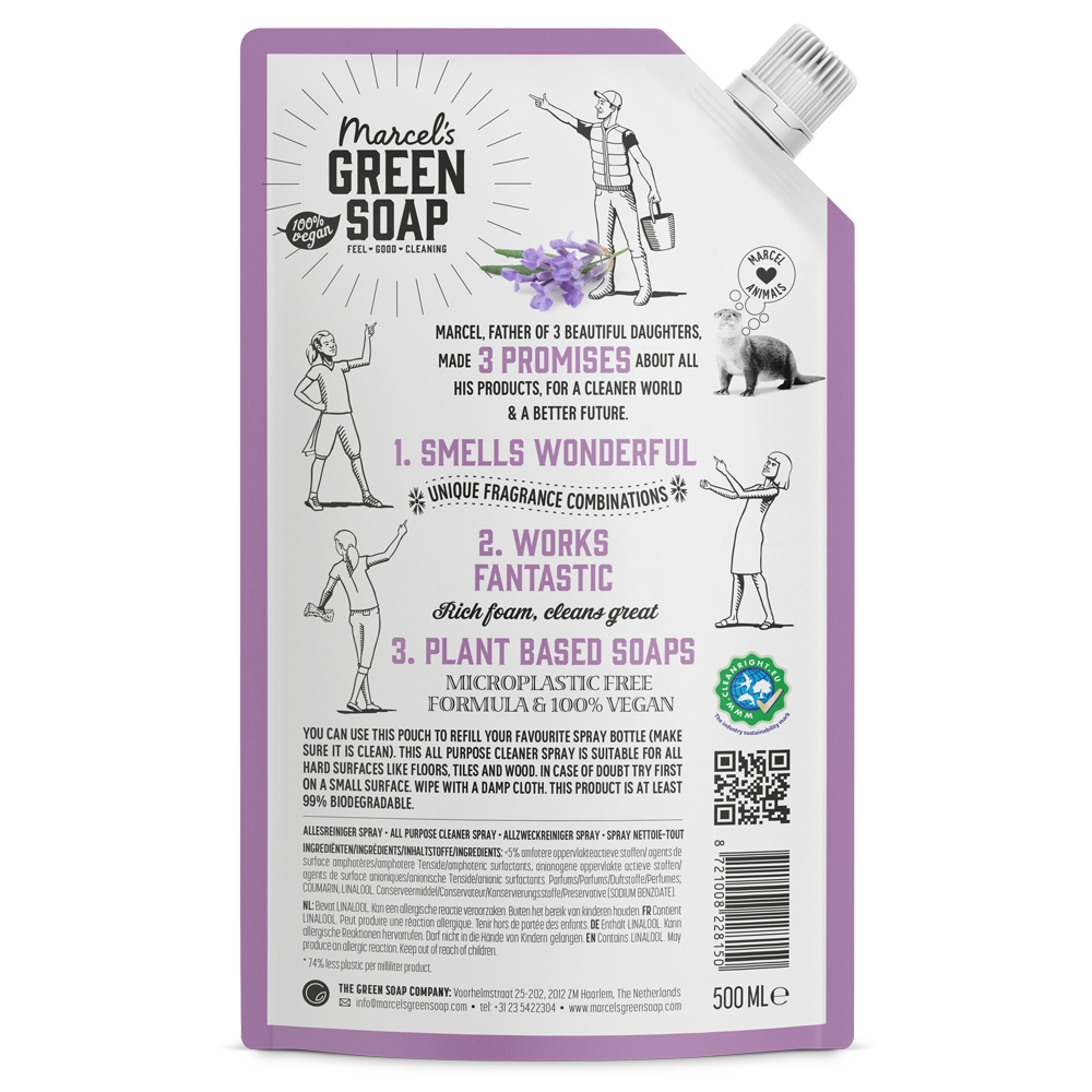 Marcel’s Green Soap Allesreiniger Spray voor de snelle schoonmaakklus tussendoor. Met de heerlijke geur van Lavendel & Rozemarijn. Met deze voordelige navulverpakking bespaar je 74% plastic t.o.v. de fles.