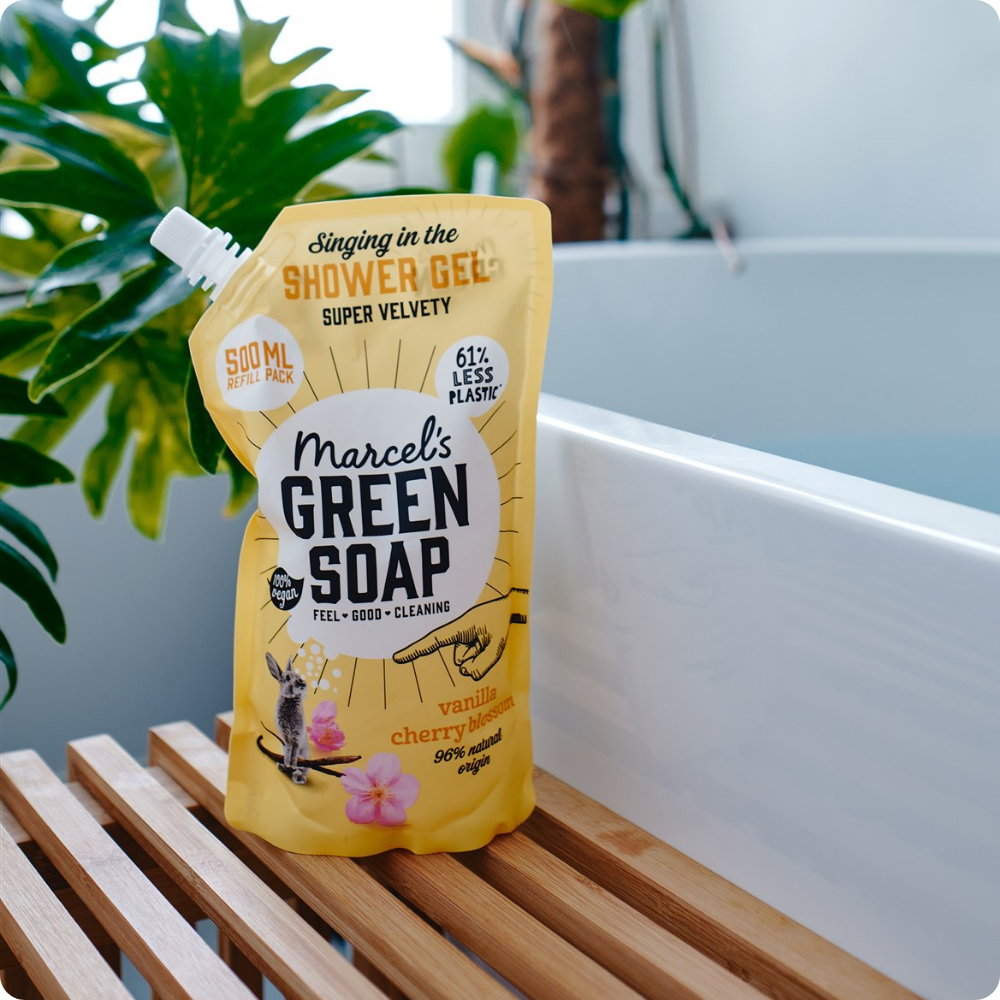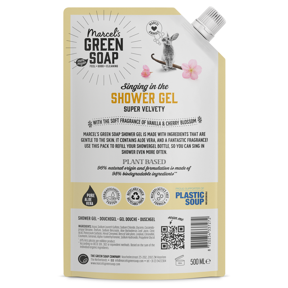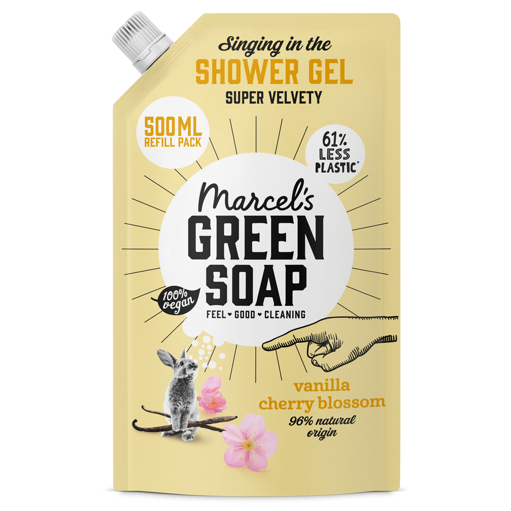 Marcel’s Green Soap Douchegel Navulling voor het refillen van Douchegel Vanille & Kersenbloesem. Met de zachte, rustgevende geur van Vanille & Kersenbloesem. Verrijkt met aloë vera en plantaardige glycerine voor extra hydratatie en zachtheid.