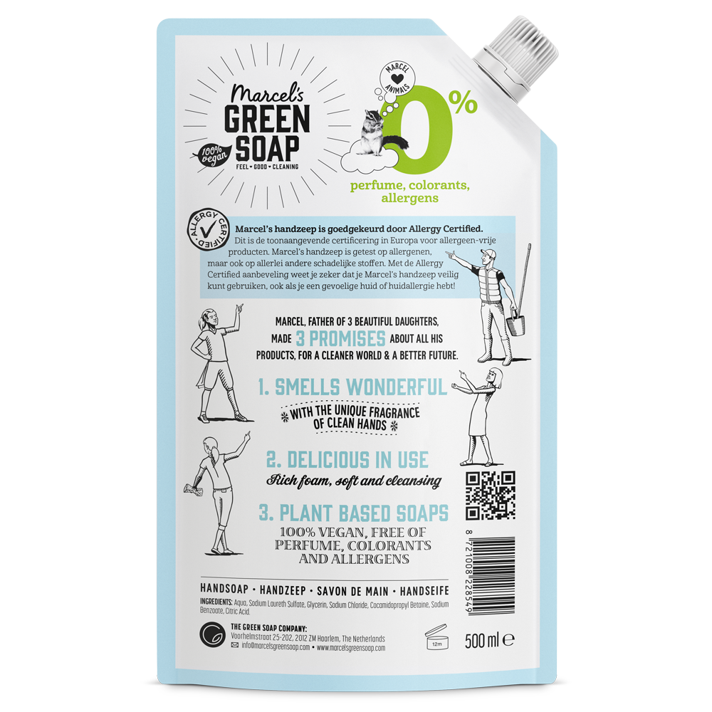 Marcel's Green Soap Handzeep 0% voor de gevoelige huid. Bevat geen parfum en kleurstoffen, Allergy Certified. Verrijkt met plantaardige glycerine voor extra hydratatie en zachtheid.