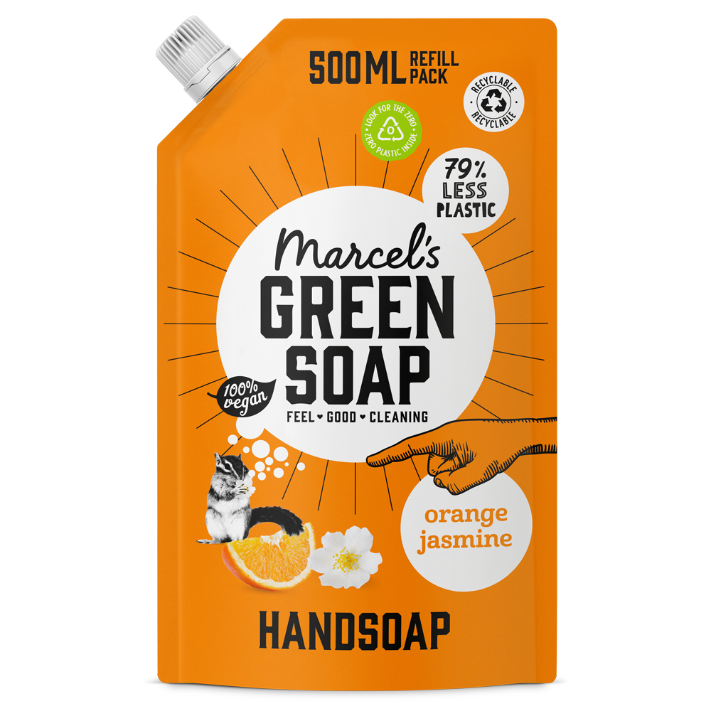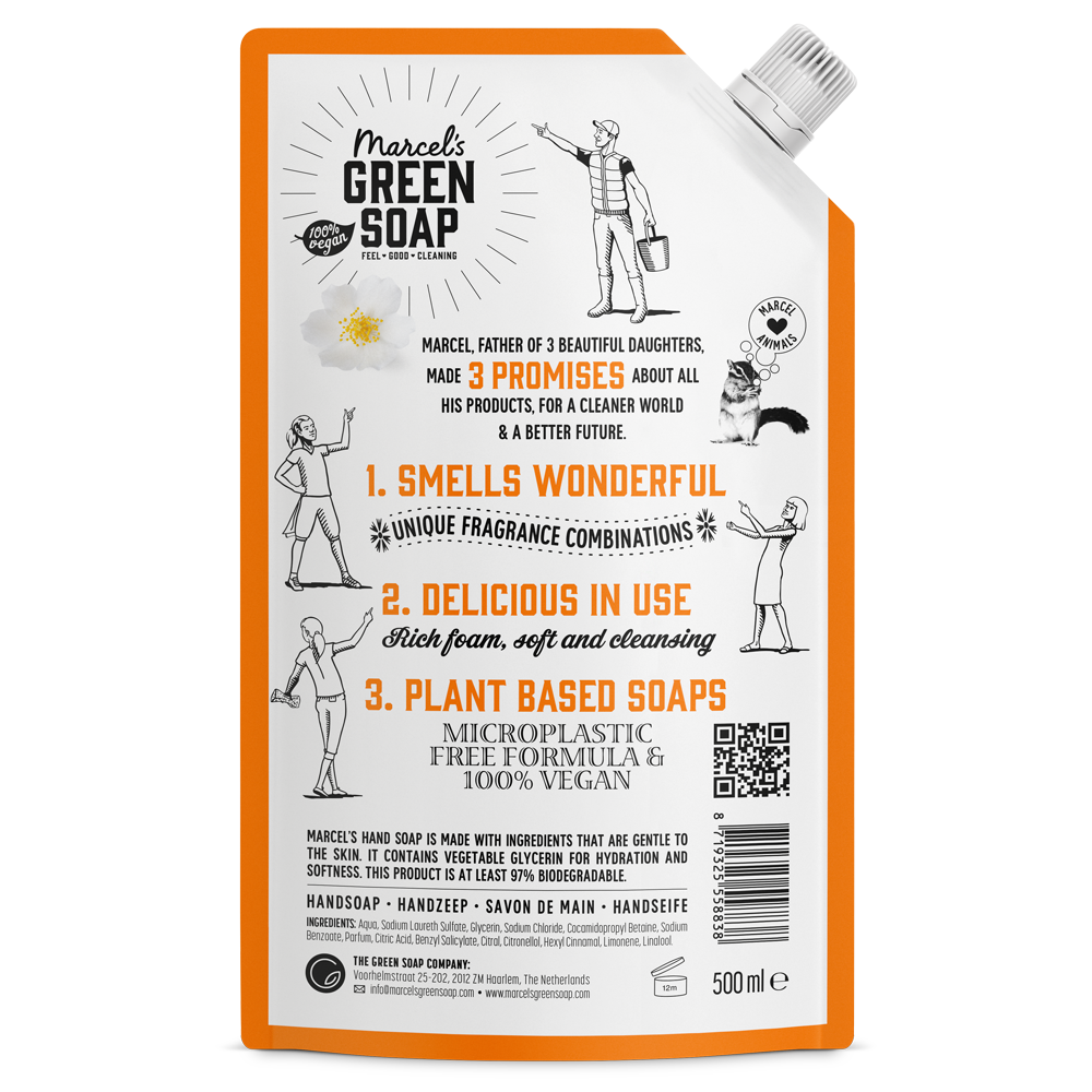 Marcel's Green Soap Handzeep voor schone en zachte handen. Met de heerlijke geur van Sinaasappel & Jasmijn en verrijkt met plantaardige glycerine voor extra hydratatie. Met deze voordelige navulverpakking bespaar je 79% plastic t.o.v. de fles.
