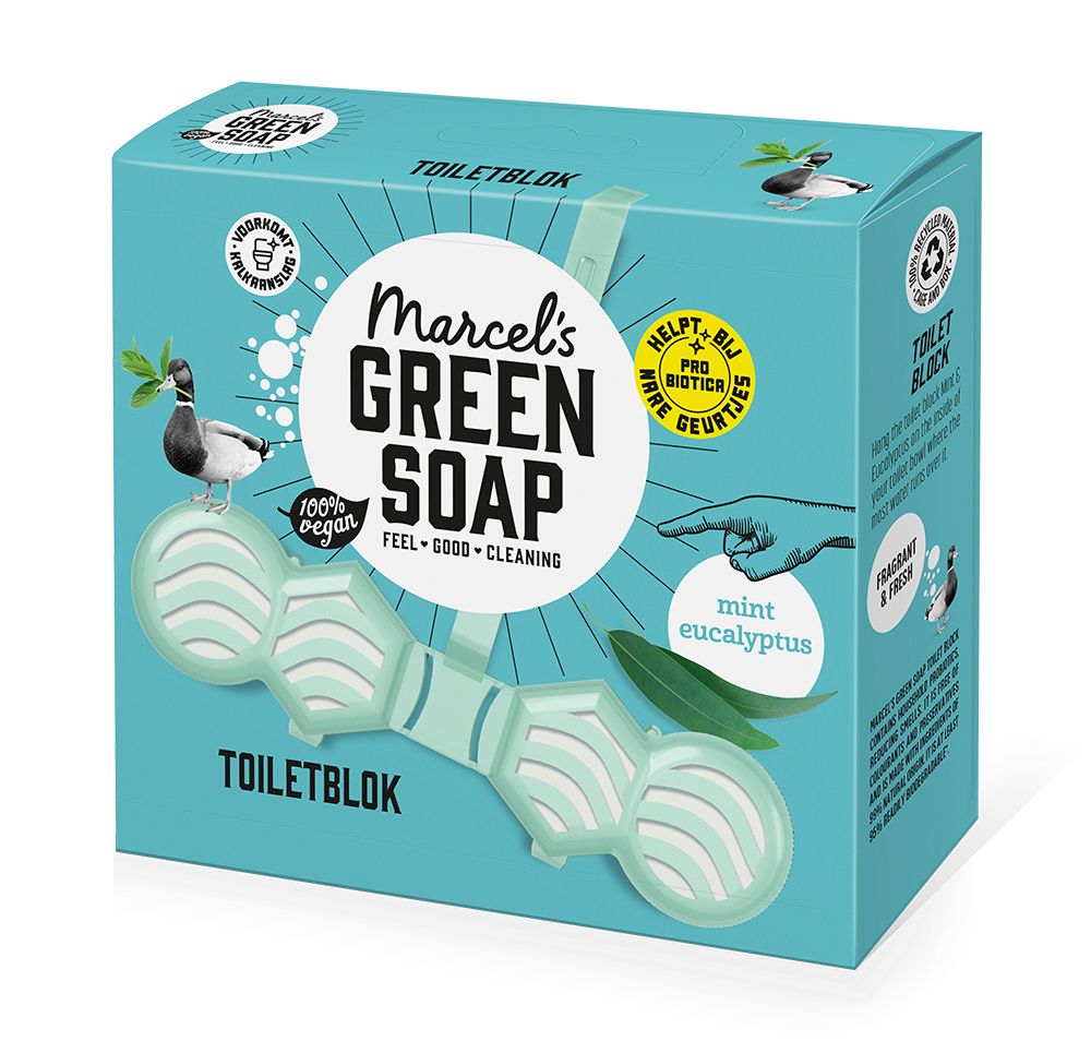 Marcel's Green Soap Toiletblok voor een heerlijk schoon toilet. Met de verfrissende geur van Munt & Eucalyptus. Bevat huishoudelijke probiotica die nare geuren verminderen.