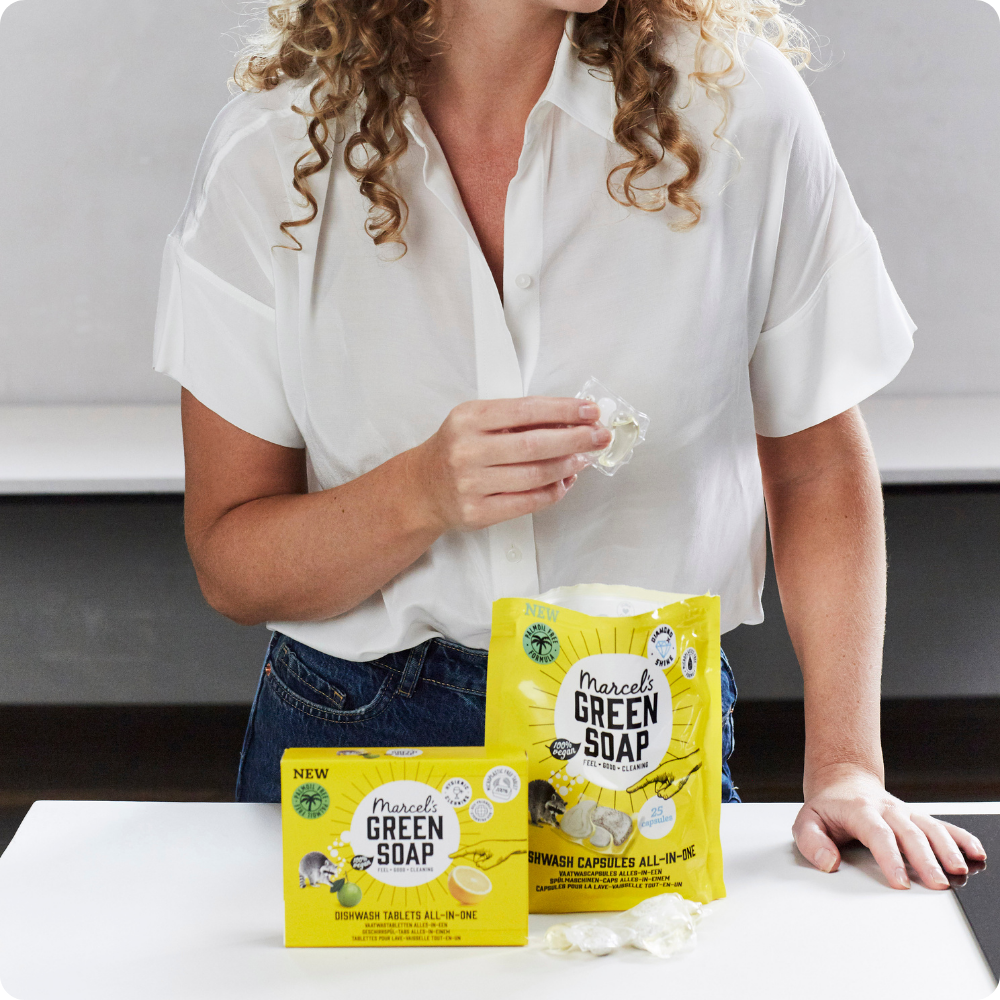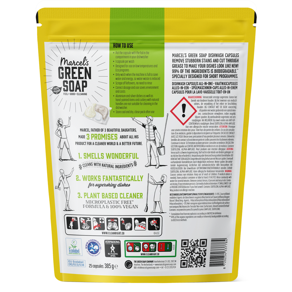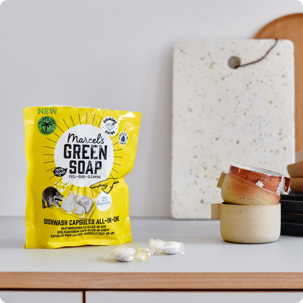 Marcel's Green Soap Alles-In-Één Vaatwascapsules voor een blinkend schone vaat. De capsules verwijderen aangekoekte etensresten en hardnekkige vlekken met gemak en beschermen servies tegen slijtage.