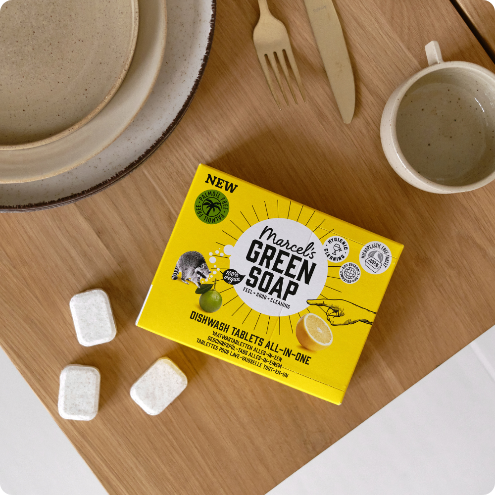 Marcel's Green Soap Alles-In-Één Vaatwastabletten voor een blinkend schone vaat. De tabletten verwijderen aangekoekte etensresten en hardnekkige vlekken met gemak.