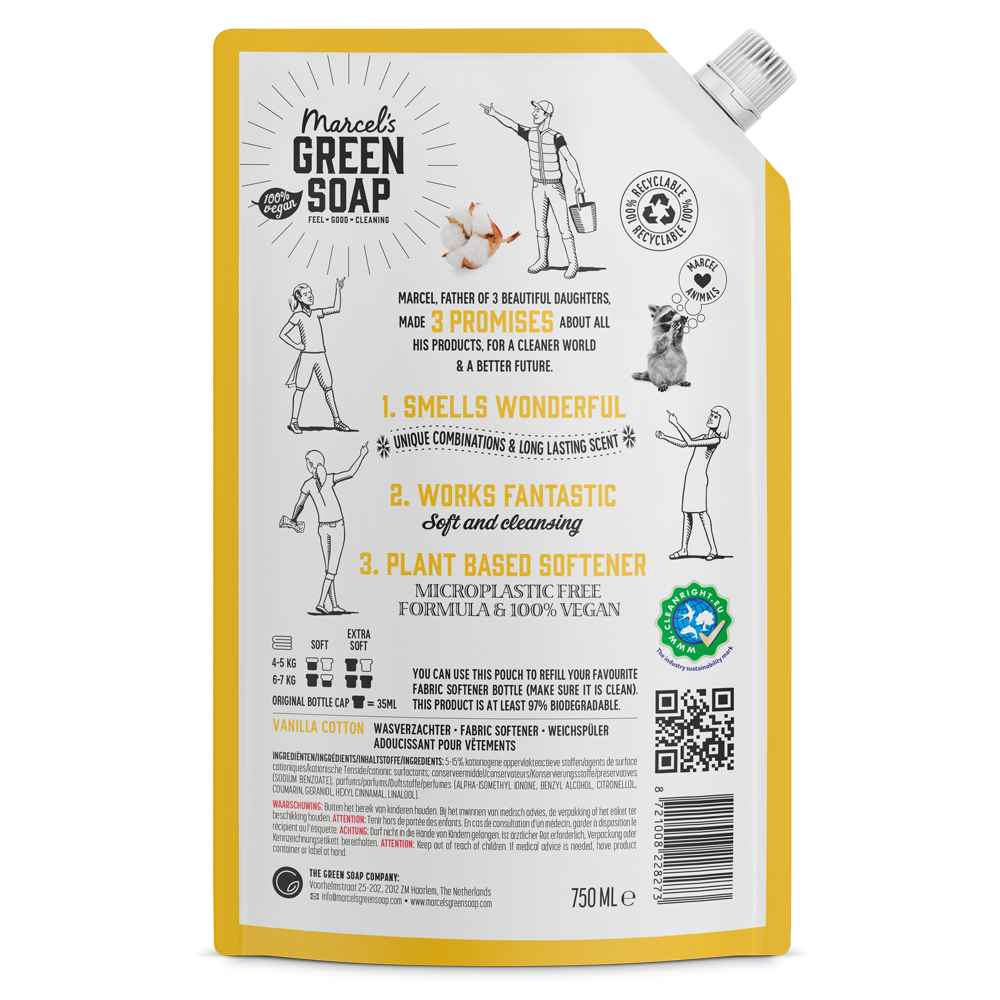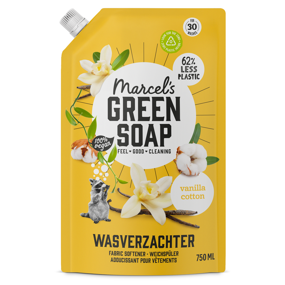 Marcel's Green Soap wasverzachter voor een extra lange geurbeleving. Met de heerlijke geur van Vanille & Katoen.