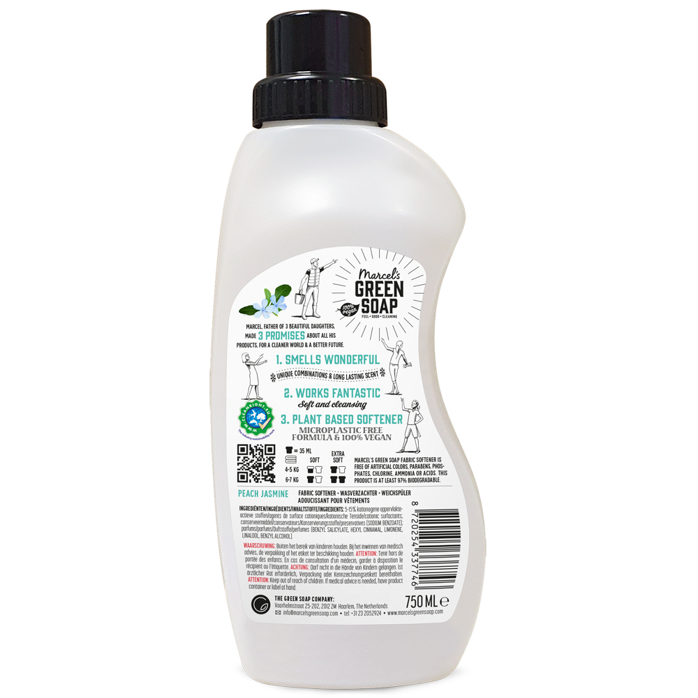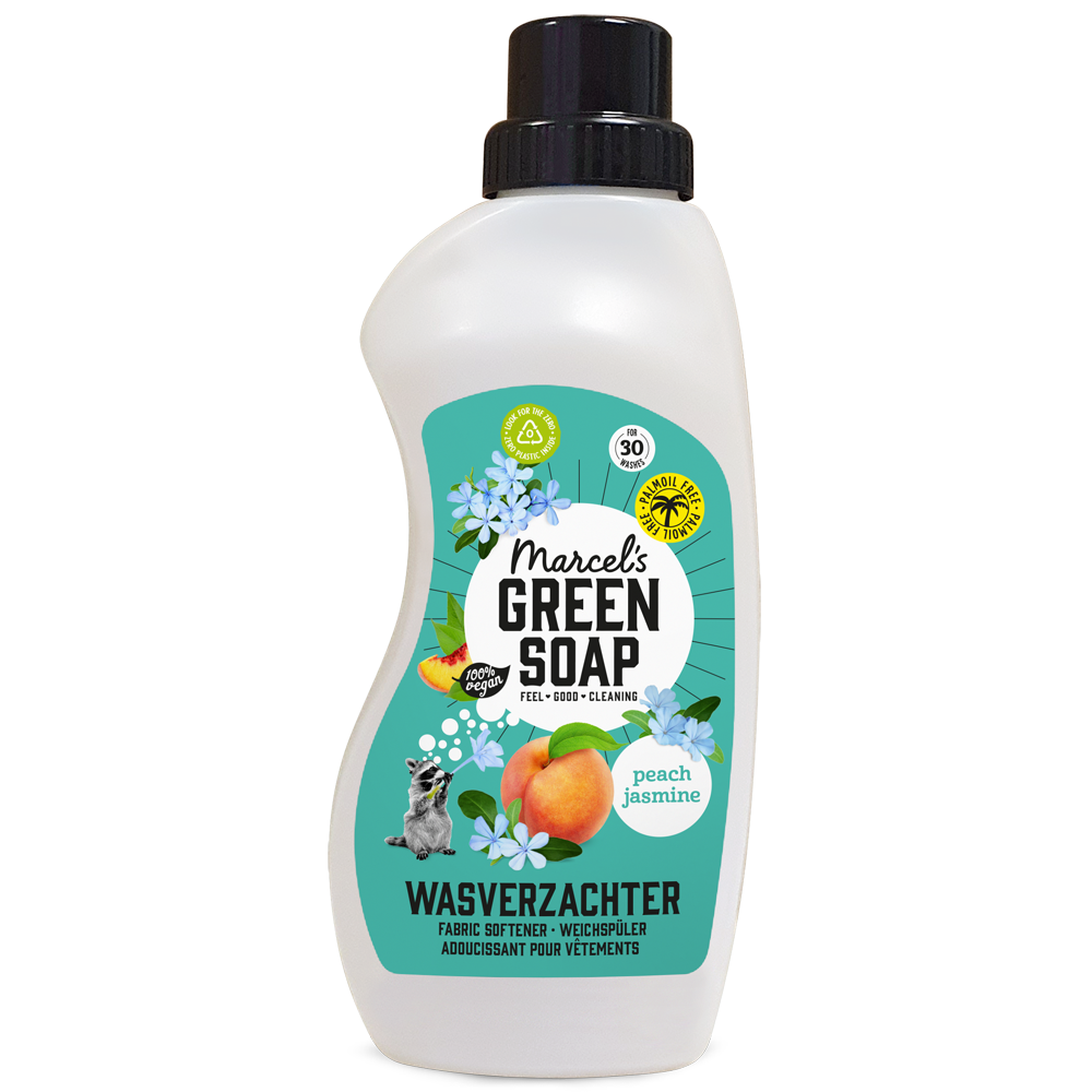 Marcel's Green Soap wasverzachter voor een extra lange geurbeleving. Met de heerlijke geur van Perzik & Jasmijn. Fles leeg? Vul 'm eenvoudig bij met de Wasverzachter Refill Perzik & Jasmijn en bespaar plastic!